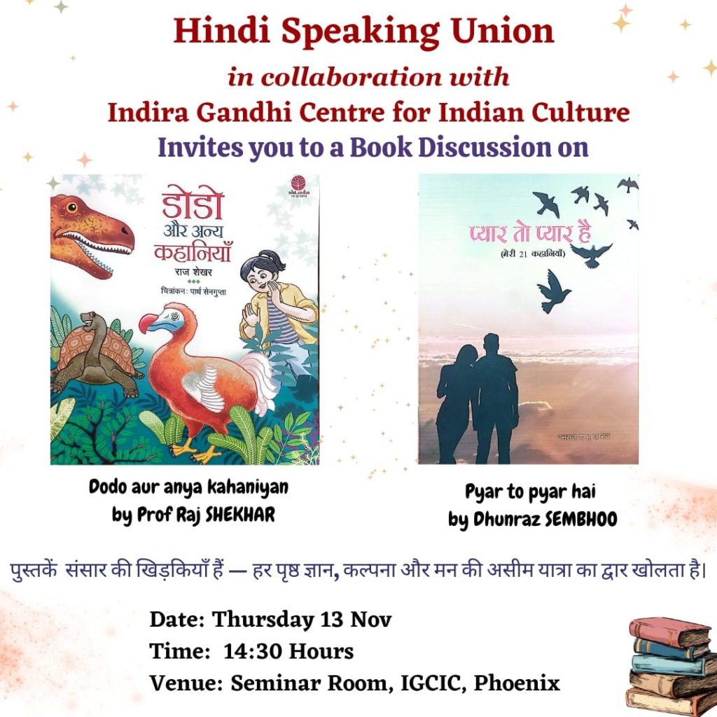One of the key objectives of the Hindi Speaking Union is to encourage and promote creative writing in Hindi. In this spirit, we are pleased to organize a Book Discussion Forum focusing on local writings in Hindi on Thursday 13th November at 14.30 hrs in the Seminar Room, IGCIC.